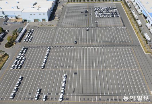 7일 광주 서구 기아차 광주공장 완성차 출고장에 스포티지와 셀토스,쏘울 등 수출차량이 트레일러 운송을 대기하고 있다. 광주=박영철 기자 |