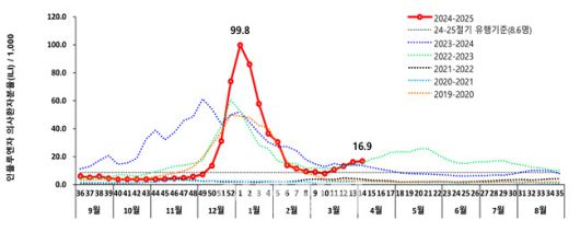 14주차(3월30~4월5일) 38도 이상의 발열과 함께 기침, 인후통이 있어 의원급 의료기관을 찾은 인플루엔자 의사환자수는 외래환자 1000명당 16.9명으로 집계됐다. 10주 8.0명 → 11주 10.8명 → 12주 13.2명 → 13주 16.3명 → 14주 16.9명 등 3월 이후 4주 연속 증가세다. 이번 절기 유행기준(8.6명)보다 높은 수준으로 유행이 지속되고 있다.
