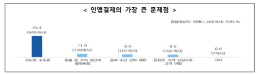 11일 방송통신위원회와 한국인터넷진흥원(KISA)의 '2024 앱 마켓 실태조사 결과'에 따르면 구글과 애플의 인앱결제에 대해 국내 앱 개발자의 대부분이 '과하다'는 입장을 보였다. 이번 조사에서 앱 내 결제의 가장 큰 문제점으로 '과도한 수수료'를 꼽은 개발자는 70.5%에 달했다. 이에 더해 '환불 등 수익 정산의 불명확함'(11.6%), '결제 수단 선택 제한'(8.9%) 등도 문제점으로 꼽혔다.