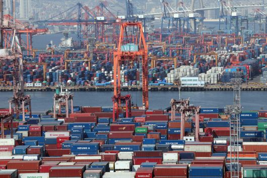 도널드 트럼프 미국 행정부의 전 세계 대상 상호관세가 발효된 9일 부산 남구 신선대(사진 아래) 및 감만(위) 부두 야적장에 수출입 컨테이너가 쌓여 있다. 2025.04.09. 뉴시스 |