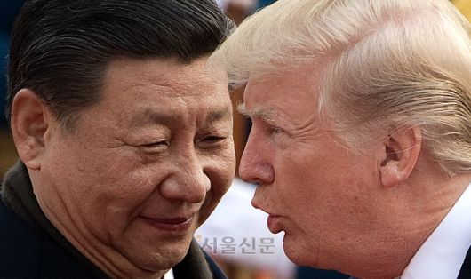 도널드 트럼프 / 시진핑 - 미중 무역전쟁이 도박 같은 치킨게임 양상을 보이는 바람에 ‘1달러당=7위안 시대’가 열렸다. 사진은 도널드 트럼프(오른쪽) 미국 대통령과 시진핑 중국 국가주석이 지난 2017년 11월 9일 베이징 인민대회당에서 열린 환영행사를 갖기에 앞서 서로 얼굴을 맞대고 환담을 나누고 있는 모습. 베이징 AFP 연합뉴스 |