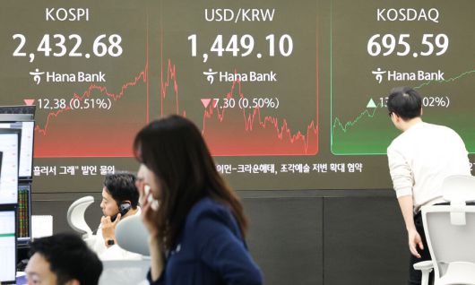 11일 서울 중구 하나은행 본점 딜링룸 전광판에 코스피지수가 전 거래일(2445.06)보다 12.34포인트(0.50%) 하락한 2432.72을 나타내고 있다. 코스닥는 전 거래일(681.79)보다 13.80포인트(2.02%) 오른 695.59로 원/달러 환율은 전 거래일(1456.4원)보다 6.5원 내린 1449.9원에 거래를 마쳤다. 뉴스1 |