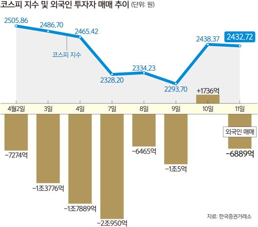 코스피가 11일 여전한 미국 관세 불확실성 속에 외국인 매도세가 다시 강해지면서 전날 급등분을 일부 반납하고 2430대에서 장을 마쳤다. 미국과 중국의 관세 전쟁으로 글로벌 경기 침체 우려가 심화하면서 투자심리가 위축된 영향이다. 하지만 도널드 트럼프 미국 대통령이 한미 간 협력 분야로 언급한 조선주는 일제히 올랐다.