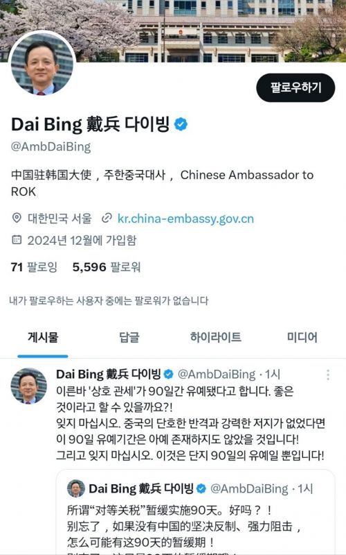 이런 발언은 미·중 관세전쟁이 격화하는 가운데 중국 당국의 전반적 입장을 대변한 것으로 보인다. 다만 다이 대사의 글에는 구체적으로 한국에 대한 언급은 없었다.