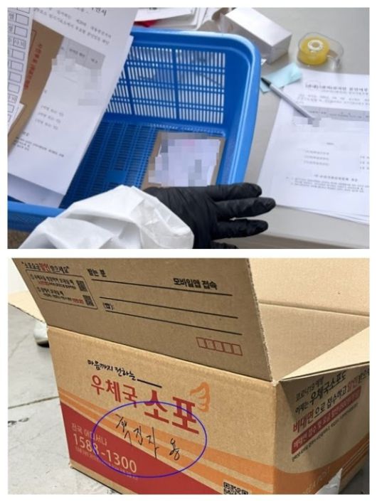 2022년 3월 대선 사전투표 당시 한 투표관리관이 코로나19 확진·격리자의 투표봉투를 ‘소쿠리’(바구니)에 넣고 있다. 아래 사진은 확진·격리자용 투표용지 종이박스. 세계일보 자료사진 |