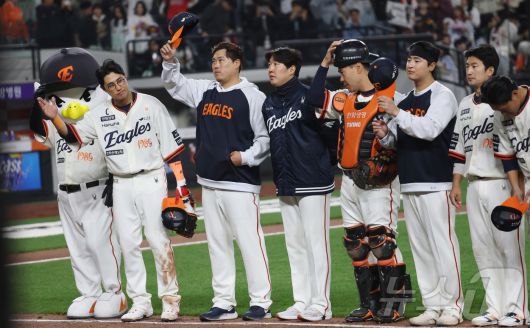 11일 대전 한화생명볼파크에서 열린 '2025 신한 SOL 뱅크 KBO리그' 한화 이글스와 키움 히어로즈 경기에서 12대2로 승리한 한화 선수들이 인사하고 있다. 2025.4.11/뉴스1 ⓒ News1 김기남 기자