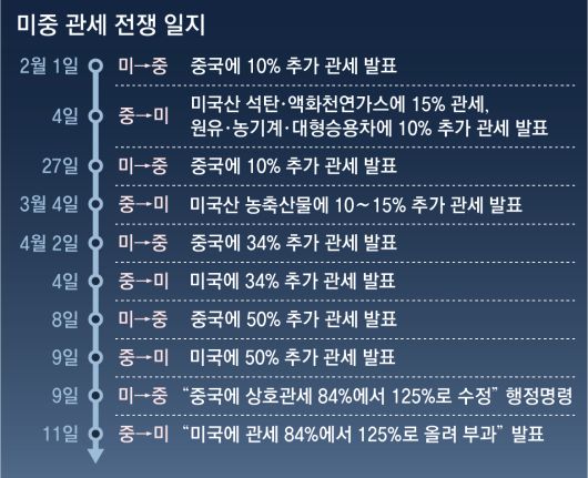 10일(현지 시간) 미국 백악관이 중국에 대한 상호관세율을 84%에서 125%로 수정 발표하자, 중국도 미국에 대한 관세율을 똑같이 84%에서 125%로 올리겠다고 11일 밝혔다. 도널드 트럼프 2기 행정부의 대중(對中) 관세율은 중국산 펜타닐(좀비 마약) 원료를 문제 삼아 기존에 부과한 20%를 합쳐 총 145%에 이르게 됐다. 앞서 중국도 미국의 펜타닐 관세에 맞서 농산물에 한해 최대 15%의 관세를 매긴 바 있어 대미 관세율은 품목에 따라 최대 140%로 엇비슷해졌다. 미중의 상대국 수출 가격이 2배 넘게 치솟은 것이다. 다만, 양국은 제품의 가격 경쟁력이 거의 상실될 정도로 관세 폭탄을 주고받음에 따라 더 이상 추가 관세 인상을 하진 않기로 했다.