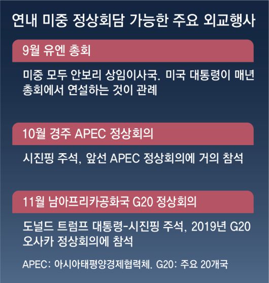 이 밖에 9월 미국 뉴욕에서 열리는 유엔총회와 경북 경주에서 10월 말∼11월 초 열리는 아시아태평양경제협력체(APEC) 정상회의도 미중 정상이 만날 수 있는 계기가 될 수 있다. 시 주석은 그간 APEC 정상회의에 줄곧 참석해 왔는데, 올 2월 우원식 국회의장을 만났을 때도 경주 APEC 참석을 “진지하게 고려하고 있다”고 했다.