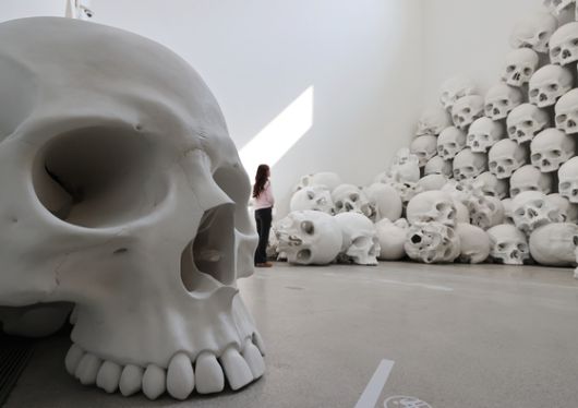 서울 삼청로 국립현대미술관 서울관에 설치된 론 뮤익의 '매스'. 거대한 두개골 100개를 쏟아질 듯 쌓아올렸다. 연합뉴스 |
