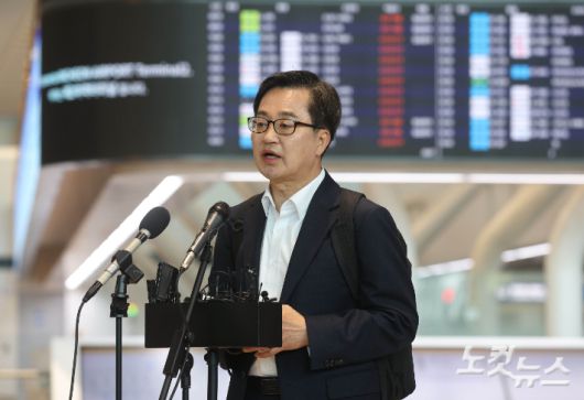 김동연 경기도지사가 9일 오전 인천공항 2터미널에서 '제21대 대통령선거' 출마 선언을 하고 있다. 황진환 기자 |