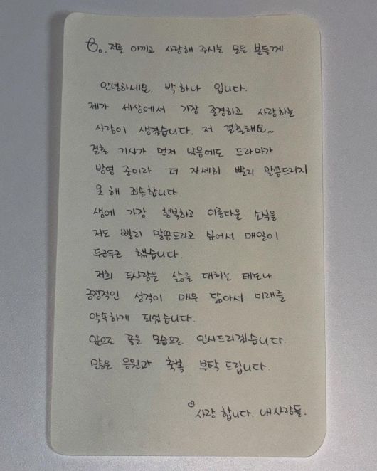 박하나는 12일 자필로 쓴 편지로 올해 결혼을 앞둔 심경을 밝혔다.