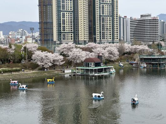 12일 강원 춘천시 공지천 벚꽃길에서 시민들이 산책하거나 오리배를 타며 휴일을 보내고 있다. 춘천/연합뉴스 |