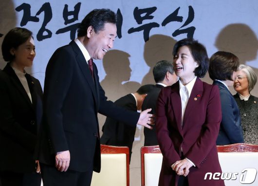 2020년 1월 2일 당시 이낙연 국무총리가 2일 오전 종로구 세종대로 정부서울청사 별관에서 열린 2020년 정부시무식 후 추미애 법무부 장관과 환하게 웃으며 대화하고 있다. 2020.1.2/뉴스1 ⓒ News1 박정호 기자 |