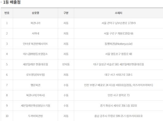 로또 1등 당첨자를 배출한 곳은 서울 관악구 남부순환로 '복권나라', 서울 구로구 개봉로 '서하네', 서울 영등포구 영중로 ‘데스콤 영등포영업소’, 인천 부평구 배곶로 ‘행운복권’, 인천 서구 원적로 ‘복권나라(가좌사)’, 대구 달성군 비슬로 ‘세븐일레븐 현풍대로점’, 대구 서구 서대구로 ‘로또명당(북부점)’, 경기 화성시 세자로 '세븐일레븐 화성봉담수기점', 충남 공주시 무령로 '두꺼비복권방', 인터넷 복권판매사이트 ‘동행복권’ 등 10곳이다.