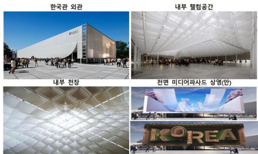한국관 건축은 총 3501.82㎡ 규모의 대형 부지에 조성됐다. 건축적 요소를 최소화하되 사계절 자연과 문화유산, 첨단 기술을 영상으로 구현한 대형 미디어파사드를 설치했다. 백색마감재, 디자인요소(한산모시, 한복저고리, 청사초롱 등)를 통해 한국적 특성을 표현했다.