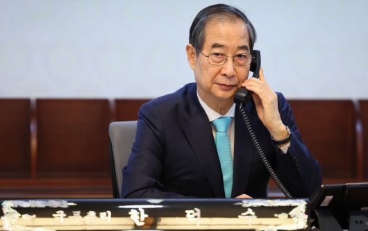 한덕수 대통령 권한대행 국무총리가 11일 정부서울청사 집무실에서 소말리아 아덴만 해역에 해외파병 중인 청해부대 44진 부대장 권용구 해군 대령과 전화 통화를 하고 있다. 연합뉴스