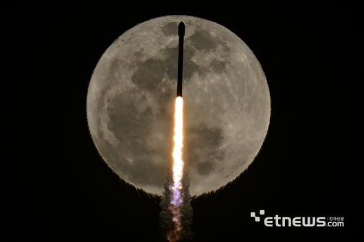 12일(현지시간) 미국 플로리다 케네디 우주센터에서 스페이스X 스타링크 위성을 실은 팰컨 9 로켓이 발사되며 핑크문 옆을 지나고 있다. 이날 발사는 인류 최초의 우주 비행 64주년 기념일에 이뤄졌다. 1961년 4월 12일 소련의 우주비행사 유리 가가린은 인류 최초로 우주 비행에 성공했다. 〈UPI〉 [Copyright © 전자신문. 무단전재-재배포금지]