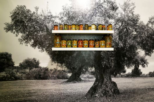지난 8일 스페인 마드리드에서 열린 한 박람회에서 올리브 나무 사진을 배경으로 올리브 열매 상품이 선반 위에 진열돼 있다. 로이터=연합뉴스 |
