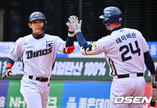 NC 다이노스 박한결이 1회말 2사 2루 좌월 2점 홈런을 치고 하이파이브를 하고 있다. 2025.04.13 / foto0307@osen.co.kr