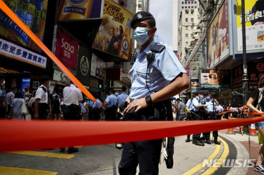 [홍콩=AP/뉴시스]영국 하원의원이 홍콩 입국을 거부당해 영국 외교당국이 항의에 나섰다. 사진은 홍콩 주권 반환 24주년 기념일인 지난 2021년 7월1일 홍콩 경찰이 연례 시위가 일어나는 빅토리아 공원 부근을 통제하는 모습. 2021.07.01.