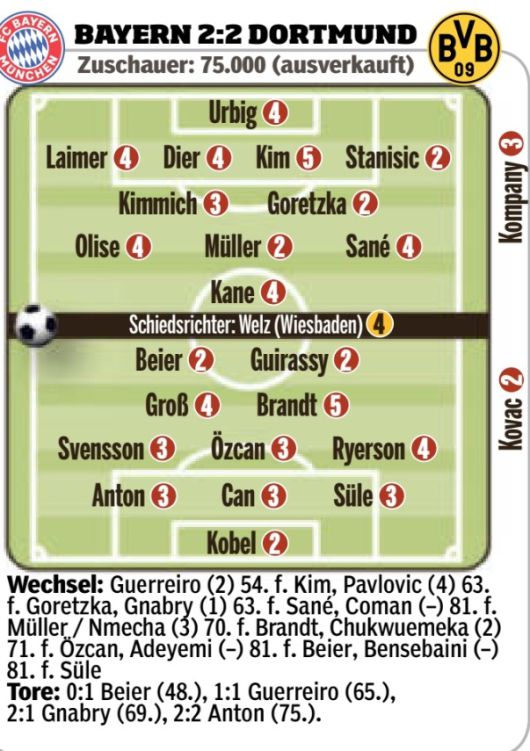 그러나 뮌헨은 후반 30분 도르트문트의 코너킥 때 골문 앞에서 벌어진 혼전 상황에서 공을 걷어내는데 실패했고, 도르트문트 센터백 안톤이 세컨볼을 골대 안으로 밀어 넣으면서 동점골을 기록했다.