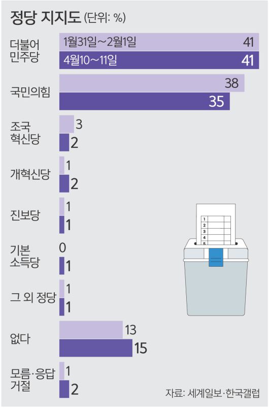 세계일보·한국갤럽이 지난 10∼11일 실시한 정당 지지도 여론조사에서 민주당 41%, 국민의힘 35%로 집계됐다. 이는 지난 1월31일∼2월1일 무선전화면접 방식으로 진행된 세계일보 창간 여론조사와 비교해 민주당은 동일한 수치를 유지했지만, 국민의힘은 3%포인트 하락한 것이다. 이번 조사에서 조국혁신당과 개혁신당은 각각 2%, 진보당과 기본소득당은 각각 1%, 없다(15%), 모름·응답거절(2%) 등으로 나타났다. 정치 성향별로는 중도층은 민주당 40%, 국민의힘 26%로 두 달 전 조사와 동일했다.