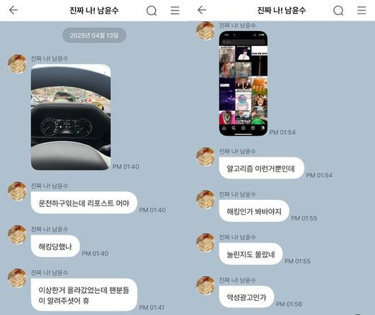 이와 관련해 남윤수는 팬들과 대화를 나누는 팬 소통 플랫폼을 통해 “운전하고 있는데 리포스트 뭐야. 해킹 당했나”라며 운전석에서 찍은 사진을 공유했다.