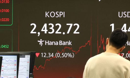 지난 11일 서울 중구 하나은행 본점 딜링룸 전광판에 코스피지수가 전 거래일(2445.06)보다 12.34포인트(0.50%) 하락한 2432.72을 나타내고 있다. 연합뉴스 |