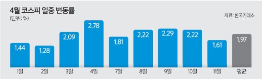 13일 한국거래소에 따르면 4월1일부터 11일까지 코스피의 일중 변동률은 평균 1.97%로 집계됐다. 이는 월별 기준 2021년 2월(2.03%) 이후 4년2개월 만에 가장 높은 수준이다.