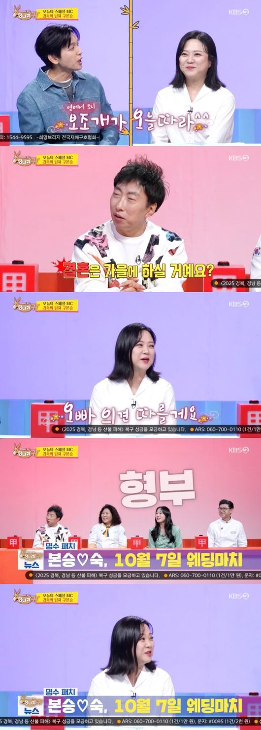 구본승에 등장에 출연자들은 “(김숙)남편이야?”라며 궁금증을 드러냈고, 박명수는 “가을 결혼?”이라면서 의향을 물었다. 김숙은 “나는 오빠 의견을 따를 거다”라고 말했고, 자막에 10월 7일 결혼이라고 등장해 눈길을 끌었다.