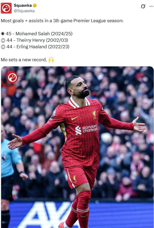 웨스트햄전 도움으로 살라는 프리미어리그 새 역사를 썼다. 축구통계매체 '스쿼카'에 따르면 프리미어리그 38경기 체제에서 살라는 지금까지 어떠한 선수보다 많은 공격포인트를 올렸다.