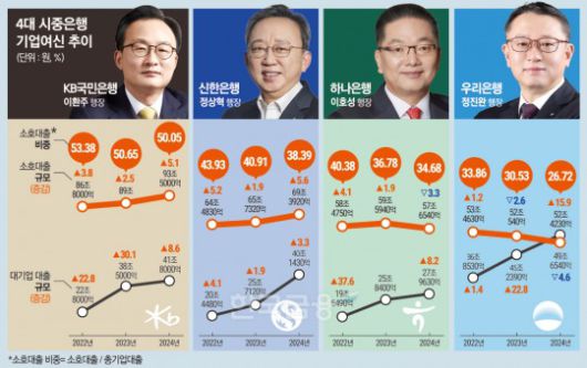 기업대출에서 소상공인 여신이 차지하는 비율도 2023년 30.53%에서 26.72%로 쪼그라들었다.