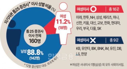 13일 한국금융신문이 증권사 사업보고서, 지배구조연차보고서 및 한금 이사회 인물뱅크를 종합한 결과에 따르면, 2025년 3월 정기 주총이 마무리 된 국내 자기자본 톱25 증권사(12월 결산법인 대상, 외국계 제외)의 이사 수는 총 160명이며, 이 중 남성 이사가 88.8%(142명)로 압도적이고, 여성 이사는 11.2%(18명)에 그쳤다.
