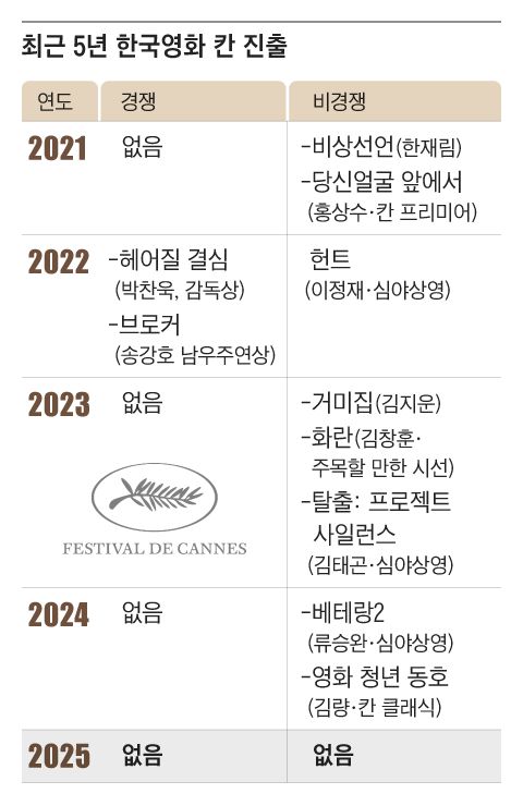 지난 10일 발표된 제78회 칸 영화제(5월 13~24일) 주요 부문 초청작에 한국 영화가 한 편도 호명되지 못했다. 주요 부문에 한국 영화가 전무한 것은 2013년 이후 12년 만에 처음이다. 한국 영화가 밀려난 자리는 일본 영화가 차지했다. 일본 영화는 황금종려상을 다투는 경쟁 부문 등에 3편 초청됐다. 한국 영화가 3년 연속 진출했던 심야상영(미드나잇 스크리닝) 부문도 일본 영화가 가져갔다. 전문가들은 “이대로 두면 K영화 전성기는 과거의 영광이 될 것”이라며 “반대로 일본 영화 독주가 당분간 지속될 수 있다”고 진단했다.