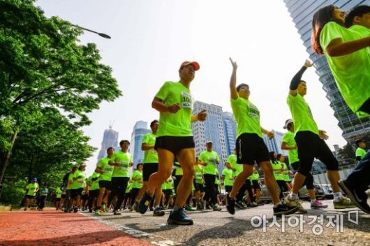 한 마라톤 대회 참가자들이 힘차게 달리고 있다. 강진형 기자 |