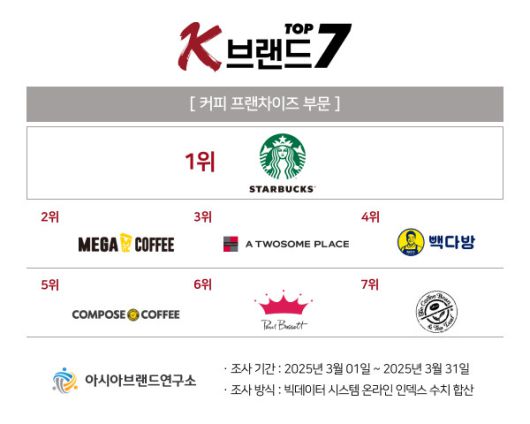 이번 ‘K-브랜드 톱7’ 커피 프랜차이즈 부문은 스타벅스가 1위를 수성했으며, 2위 메가커피, 3위 투썸플레이스, 4위 빽다방, 5위 컴포즈커피, 6위 폴바셋, 7위 커피빈 등이 상위권에 이름을 올렸다.