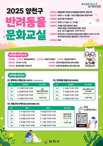 이기재 양천구청장은 "반려동물 문화교실을 통해 반려동물의 문제행동 등으로 인한 갈등과 어려움을 해소하고, 반려동물과 함께하는 구민의 일상이 더 행복해지기를 바란다"며 "앞으로도 구민들의 행복하고 건강한 반려동물과의 동행을 위해 다양한 지원을 추진해 나가겠다"고 말했다.
