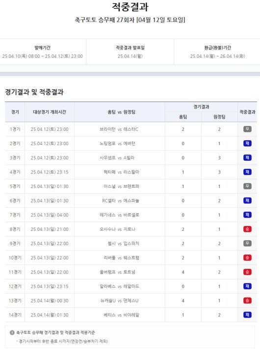 베트맨, 14일(월) 해외축구 14경기 대상 축구토토 승무패 27회차 적중결과 발표