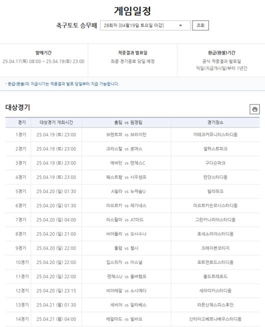 다음 회차인 축구토토 승무패 28회차는 4월 17일(목) 오전 8시에 발매를 시작해, 4월 19일(토) 오후 11시까지 전국 스포츠토토 판매점 및 공식 온라인 발매사이트 ‘베트맨’을 통해 구매할 수 있다.