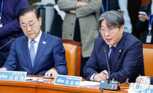 (서울=뉴스1) 안은나 기자 = 이춘석 더불어민주당 대선특별당규준비위원장이 14일 오전 서울 여의도 국회에서 열린 중앙위원회의에 참석해 안건 보고를 하고 있다. 민주당은 이날 전당원 투표와 중앙위 의결을 거쳐 권리당원 투표 50%·일반 국민 여론조사 50% 방식의 대선 경선 규칙을 확정한다. 2025.4.14/뉴스1