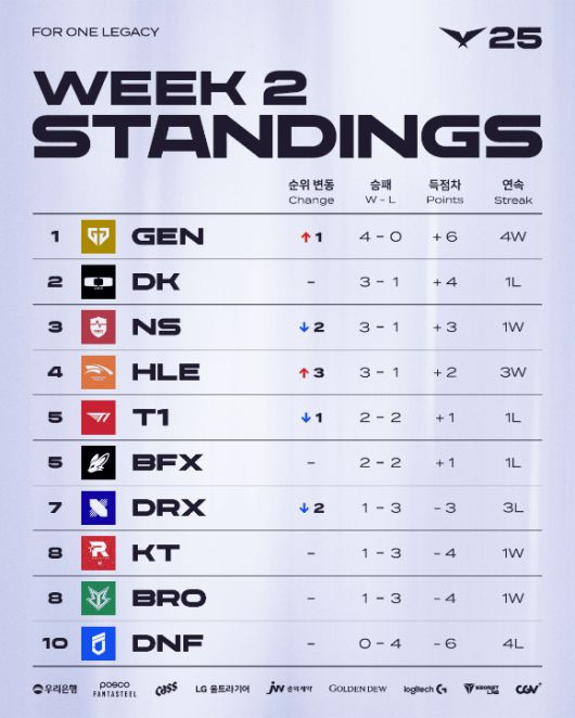 1주 차에서 한화생명e스포츠와 T1이라는 난적을 만나 모두 승리하면서 기세를 탄 젠지는 2주 차에 배정된 두 경기도 모두 승리하며 개막 이후 유일하게 1패도 당하지 않은 팀으로 남았다.