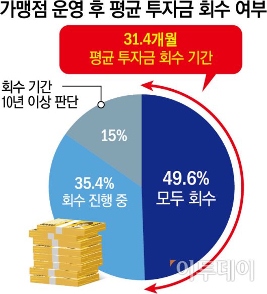 개설 투자금의 회수 여부에 대해 ‘모두 회수하였음’이 49.6%로 가장 많았고, ‘회수 진행 중’(35.4%), ‘수익성이 떨어져 투자금 회수가 10년 이상 어려울 것으로 판단’(15.0%)의 순으로 나타났다. 투자금을 모두 회수하는데 걸린 기간은 평균 31.4개월로 나타났으며, ‘회수 진행 중’에 응답한 사람들의 회수 예상 기간은 평균 38.6개월로 집계돼 대체로 프랜차이즈 가맹점의 경우 약 3년 정도의 투자금 회수 기간이 소요됐다.
