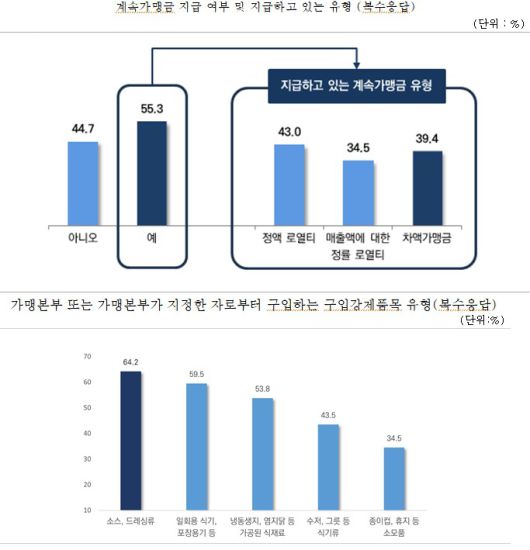 일반적으로 창업을 시작할 때 가맹점 사업자는 영업표지 사용에 대한 가맹비, 교육비 등을 가맹본부에 지급하는데, 응답업체의 55.3%는 창업 이후에도 △정액 로열티(43.0%) △차액가맹금(39.4%) △매출액에 대한 정률 로열티(34.5%) 형태로 가맹본부에 계속가맹금을 지급하고 있다고 답변했다. 차액가맹금은 가맹본부가 가맹점이 구매하는 필수적인 품목을 공급할 때 적정한 도매가격에 붙이는 일종의 유통 마진이다. 계속가맹금은 영업표지 사용료, 교육비, 경영지원비 등 명칭과 관계없이 가맹점이 가맹본부에 정기적 또는 비정기적으로 지급하는 모든 대가다.