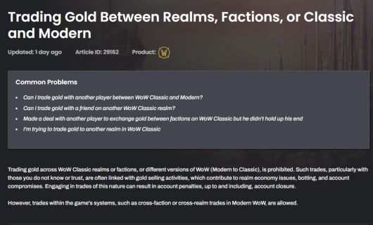 13일 블리자드는 공식 홈페이지에서 새로운 정책을 발표했다. 기본적으로 게임 내 시스템을 이용한 거래 외 게임 버전 간 또는 다른 서버 및 진영 간 골드 교환 행위를 금지한다는 내용이다.