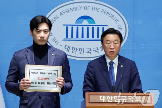 (서울=뉴스1) 안은나 기자 = 이용우 더불어민주당 법률위원장(오른쪽)과 한준호 최고위원이 14일 서울 여의도 국회 소통관에서 한덕수 대통령 권한대행 직권남용·직무유기죄 혐의 고위공직자범죄수사처(공수처) 고발 기자회견을 하고 있다. 2025.4.14/뉴스1