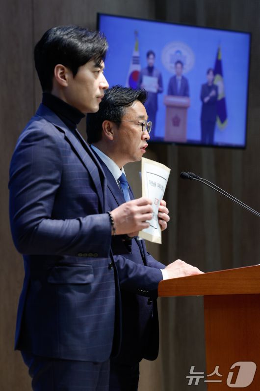 (서울=뉴스1) 안은나 기자 = 이용우 더불어민주당 법률위원장(오른쪽)과 한준호 최고위원이 14일 서울 여의도 국회 소통관에서 한덕수 대통령 권한대행 직권남용·직무유기죄 혐의 고위공직자범죄수사처(공수처) 고발 기자회견을 하고 있다. 2025.4.14/뉴스1