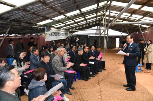 ▲유희태 완주군수가 14일 전북 완주 이서면 남계리 천주교 유적을 찾은 국가유산청 문화유산위원회 심사위원단에 유적의 역사적 가치를 설명하고 있다. ⓒ완주군 제공 |