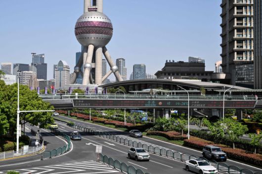 중국 상하이 금융지구에서 14일 상하이 종합지수와 선전 성분지수가 표시된 스크린이 설치된 보행자 육교가 차량 위로 보이고 있다. 도널드 트럼프 미국 대통령은 전날 일부 관세에 대해 90일간 유예 조치를 했음에도 불구하고 어떤 나라도 관세로부터 "무사할 수 없다"고 경고했다. /AFP 연합뉴스 |