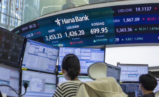 14일 오전 서울 중구 하나은행 본점 딜링룸의 전광판에 이날 거래를 시작한 코스피와 코스닥지수, 원-달러 환율 거래가가 표시돼 있다. 연합뉴스 |