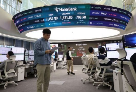 14일 서울 중구 하나은행 딜링룸에서 딜러들이 대화하고 있다. 연합뉴스 |